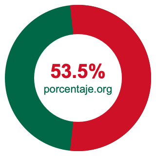 Empezamos por mostrarle el gráfico circular a continuación. Primero, coloreamos el círculo entero en verde. Luego, recortamos el 53.5 por ciento del círculo y lo coloreamos en rojo.