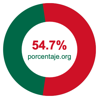 Empezamos por mostrarle el gráfico circular a continuación. Primero, coloreamos el círculo entero en verde. Luego, recortamos el 54.7 por ciento del círculo y lo coloreamos en rojo.