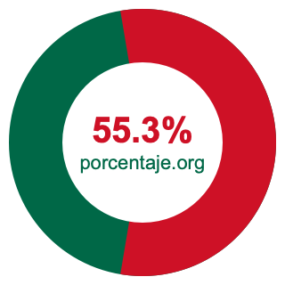 A continuación está otra manera de mostrar el 55.3 por ciento en un gráfico circular. Otra vez, primero coloreamos la imagen entera en verde, y luego coloreamos el 55.3 por ciento de la imagen en rojo.