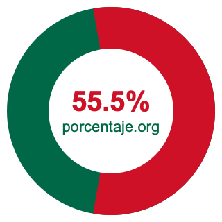 Empezamos por mostrarle el gráfico circular a continuación. Primero, coloreamos el círculo entero en verde. Luego, recortamos el 55.5 por ciento del círculo y lo coloreamos en rojo.