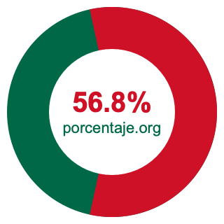 Empezamos por mostrarle el gráfico circular a continuación. Primero, coloreamos el círculo entero en verde. Luego, recortamos el 56.8 por ciento del círculo y lo coloreamos en rojo.
