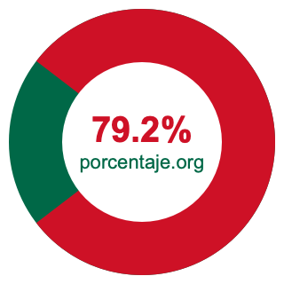 Empezamos por mostrarle el gráfico circular a continuación. Primero, coloreamos el círculo entero en verde. Luego, recortamos el 79.2 por ciento del círculo y lo coloreamos en rojo.