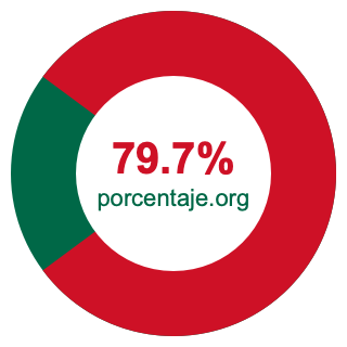 Empezamos por mostrarle el gráfico circular a continuación. Primero, coloreamos el círculo entero en verde. Luego, recortamos el 79.7 por ciento del círculo y lo coloreamos en rojo.