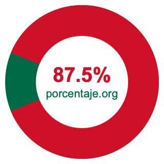 A continuación está otra manera de mostrar el 87.5 por ciento en un gráfico circular. Otra vez, primero coloreamos la imagen entera en verde, y luego coloreamos el 87.5 por ciento de la imagen en rojo.