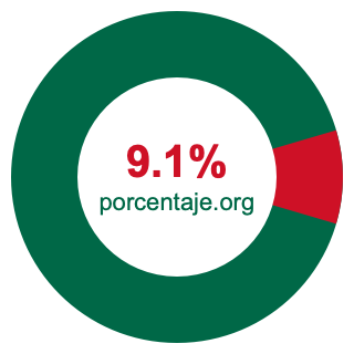 Empezamos por mostrarle el gráfico circular a continuación. Primero, coloreamos el círculo entero en verde. Luego, recortamos el 9.1 por ciento del círculo y lo coloreamos en rojo.