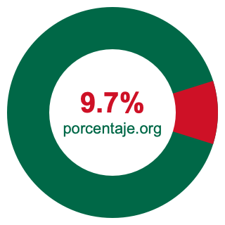 Empezamos por mostrarle el gráfico circular a continuación. Primero, coloreamos el círculo entero en verde. Luego, recortamos el 9.7 por ciento del círculo y lo coloreamos en rojo.