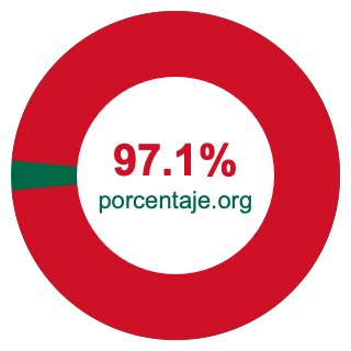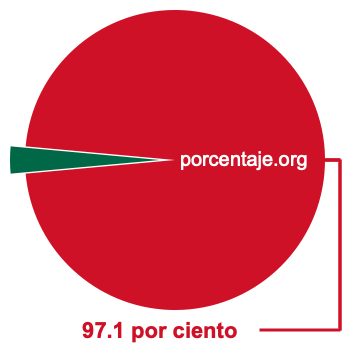 Empezamos por mostrarle el gráfico circular a continuación. Primero, coloreamos el círculo entero en verde. Luego, recortamos el 97.1 por ciento del círculo y lo coloreamos en rojo.
