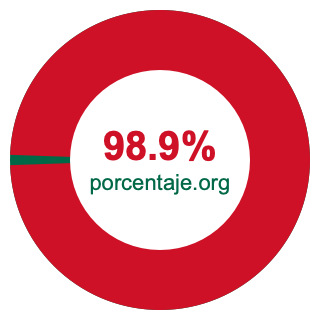 Empezamos por mostrarle el gráfico circular a continuación. Primero, coloreamos el círculo entero en verde. Luego, recortamos el 98.9 por ciento del círculo y lo coloreamos en rojo.